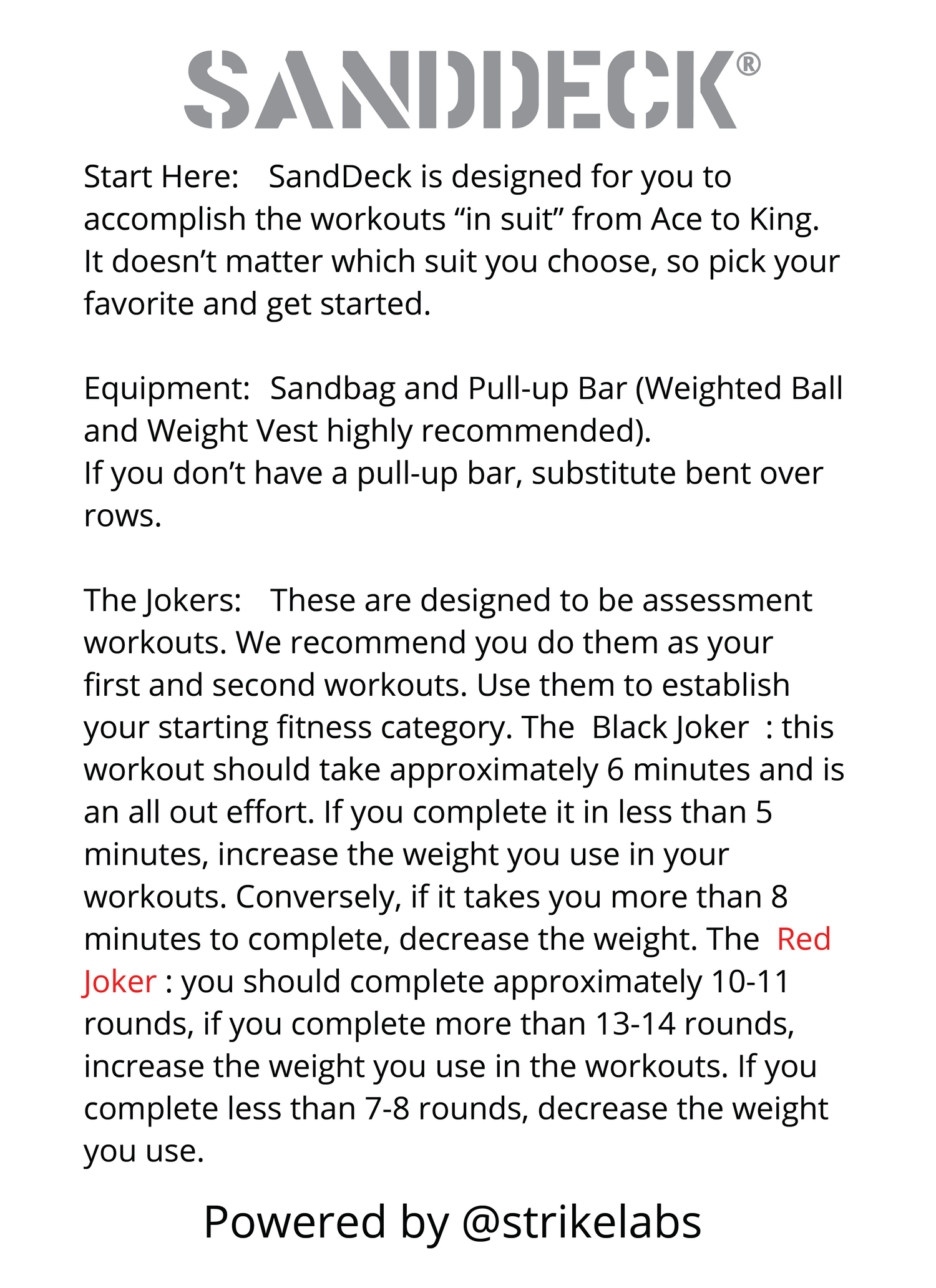 SandDeck® is a Functional Fitness Program with 54 unique workouts! That’s 10+ weeks of fitness programming. Perfect for tactical athletes but scalable for all fitness levels. All you need is a sandbag to get started. Work your way through the whole deck and then start over with a heavier sandbag. Or mix and match suits for a completely different experience. The possibilities are endless.