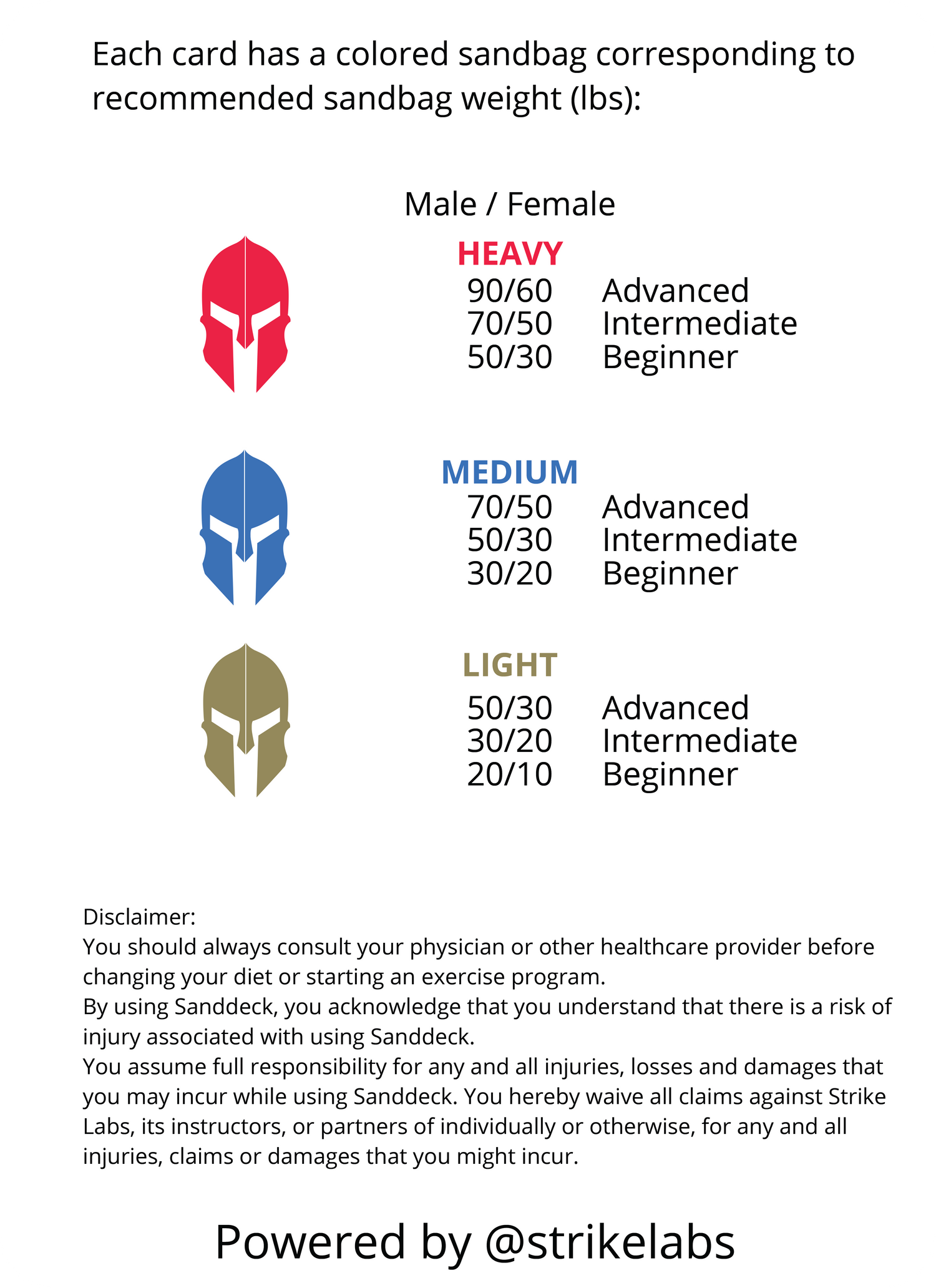 Every card has a complete workout. Each workout has a prescribed sandbag weight based on your fitness level: advanced, intermediate, beginner.